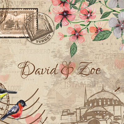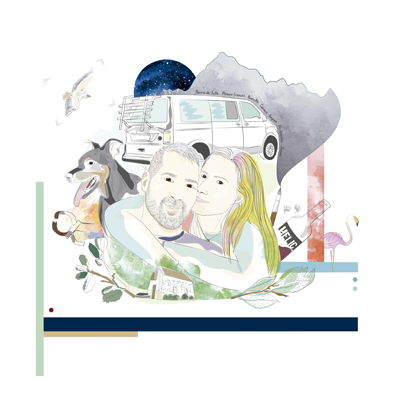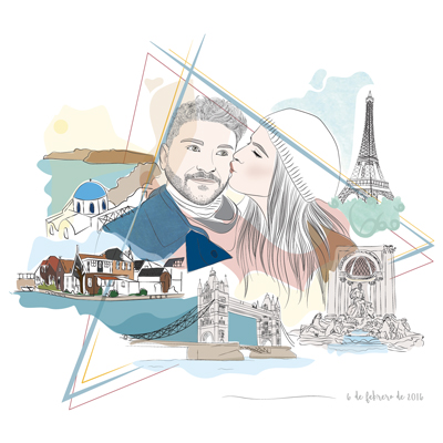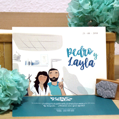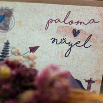 Paloma y Nayel querían un tarjetón de boda que plasmara su espíritu viajero a modo de postal. Buscaban un diseño romántico con el que ilustrar el inicio de su andadura como matrimonio, los viajes que han realizado juntos y los muchos que esperan hacer realidad.