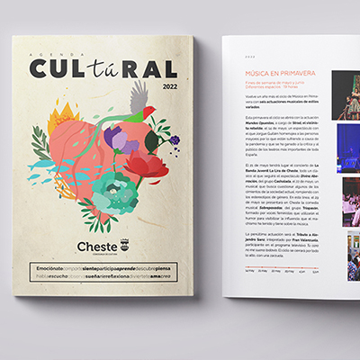 La Concejalía de Cultura del Ayuntamiento de Cheste ha programado, por primera vez en el municipio, las actividades culturales de todo el año. Hemos diseñado la imagen de esta agenda anual y la hemos adaptado a diferentes formatos en papel y para su uso en internet y redes sociales.