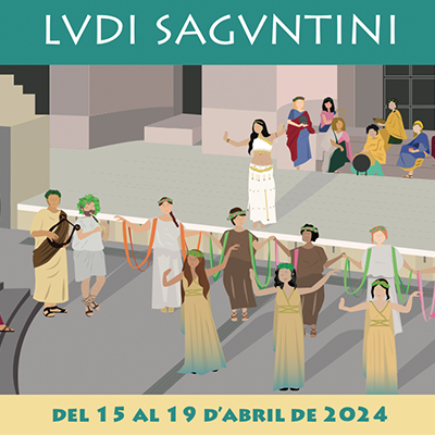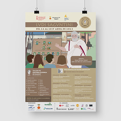 Cartel para la XXVII edición de los Ludi Saguntini, evento que se desarrolla en Sagunto de forma anual y que ofrece talleres y actividades al aire libre y un festival de teatro grecolatino de ámbito escolar.