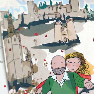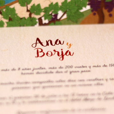 Os presentamos el trabajo realizado para Andrea y Jose, una entrañable pareja que ha confiado en nosotras para diseñar una invitación llena de detalles y de ternura. Buscaban una ilustración orginial, que hiciera referencia a sus dos ciudades de origen (él de Granada, ella de Valencia) y a su camino juntos. Además de diseñar el tarjetón de boda, nuestro tándem también se ha encargado de los meseros para el día de la celebración.