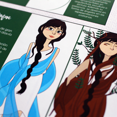 Dibujamos para cada metamorfosis, por una parte, una ilustración que sirve como fondo para teatralizar el mito y por otra, la ilustración de los personajes principales de cada historia, en su forma original y en su metamorfosis: Dafne y el olivo, Clitia y el girasol o Cipariso y el ciprés. Cada personaje está maquetado para ser un recortable que, una vez cortado y montado, puede utilizarse como figura para la representación teatral de la historia.