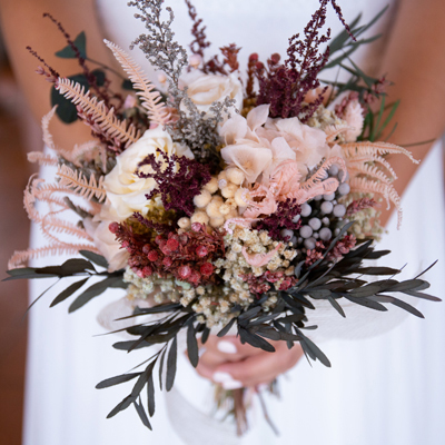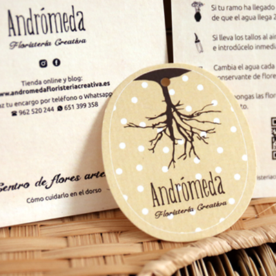Realizamos la composición sobre una textura con un estilo vintage muy sutil para combinar después con un sobre en papel kraft, decorado con un adorno de flor preservada y etiqueta.